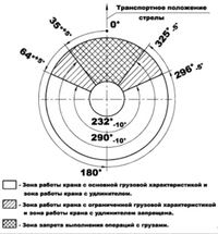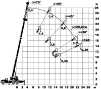 – Граница допустимого наклона стрелы с грузом.Диаграмма зон выполнения крановых операций